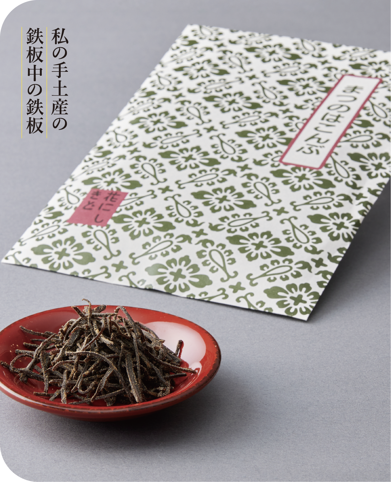 すっぽんのだしで炊いた北海道産真昆布を松のように刻み、山椒の香りを効かせた塩昆布。大阪・江戸堀にある料亭「花錦戸 煌日菴」で、すっぽん会席の締めに提供されている。そのままはもちろん、料理の味付けにも。
