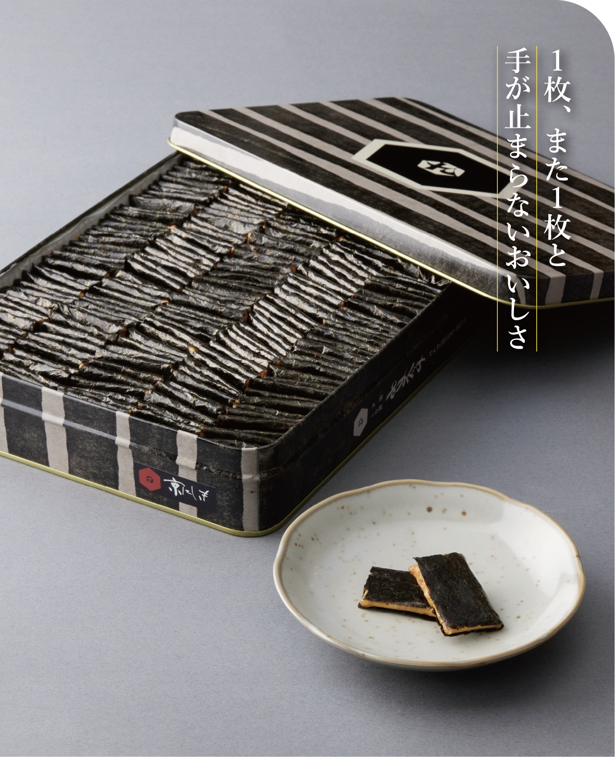 東京・九段にあるあられ・かきもち専門店ののりあられ。ふたを開けると、真っ黒なあられがぎっしり詰まったビジュアルが印象的。丁寧に手焼きされ、米としょうゆ、のりの素朴ながらも風味豊かな味わいが楽しめる。