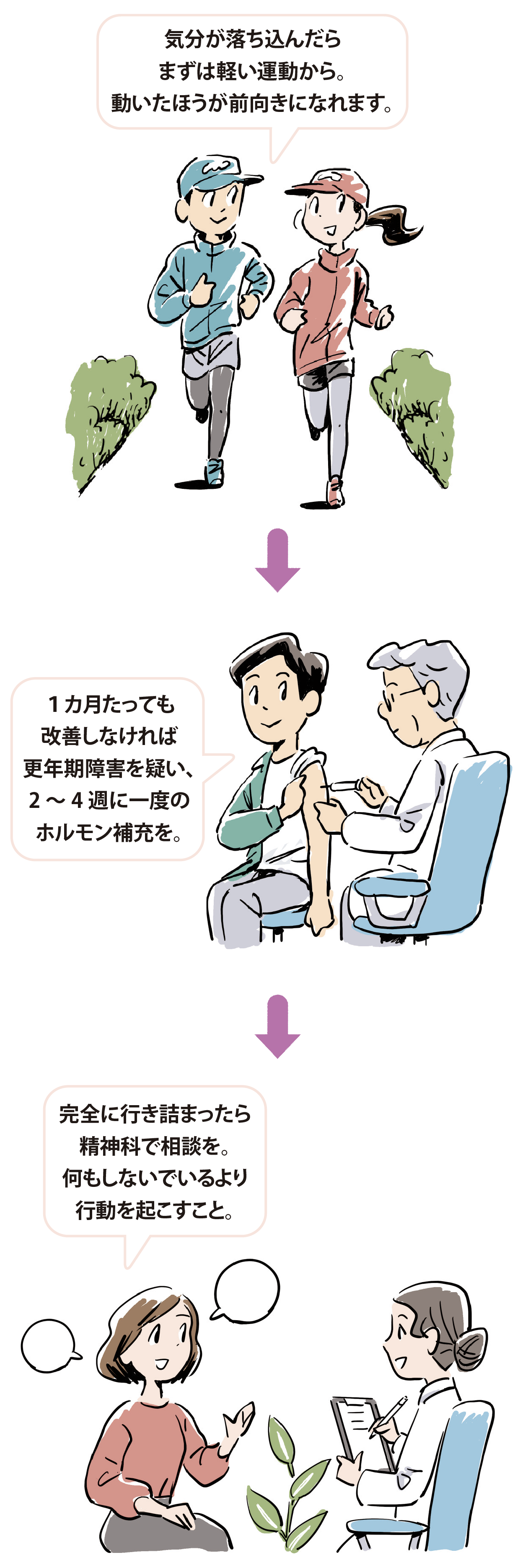 元気がなくなったと思ったら、まずはしっかり睡眠をとり、適度な運動と精のつく食事をする。軽いうつなら1カ月以内にはよくなるはず。体調や気分が変わらなければ更年期障害を疑い、男性なら泌尿器科、女性なら婦人科に行きホルモン補充を。それでも自身のパフォーマンスに満足がいかない、うつ状態が続くようなら精神科・心療内科に行き、相談しよう。