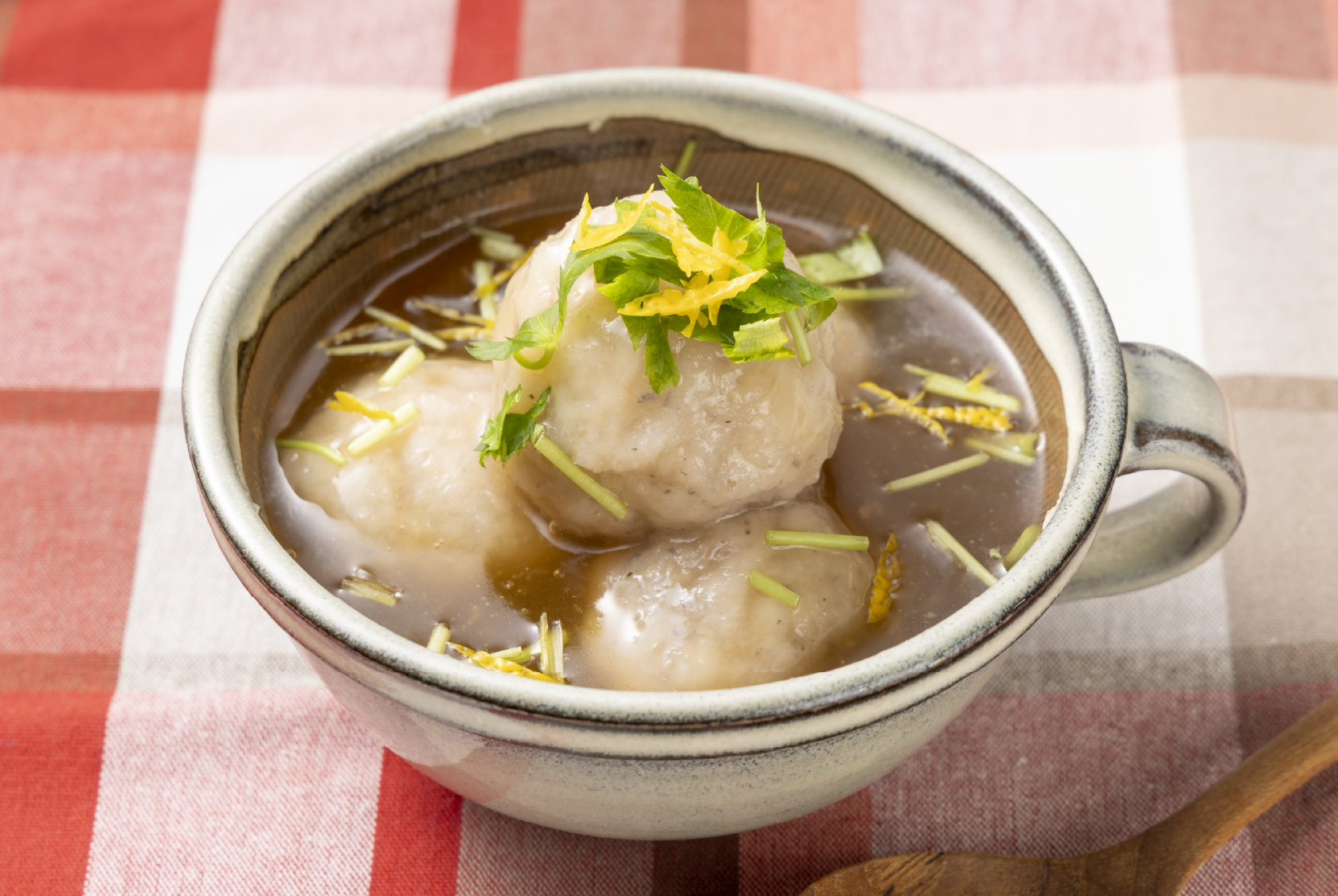 2. Aを沸かし、一口大に丸めた1を入れてゆでる。水溶き片栗粉でとろみをつけ、長さ1cmに切ったみつば、ゆずの皮のせん切りを加える。