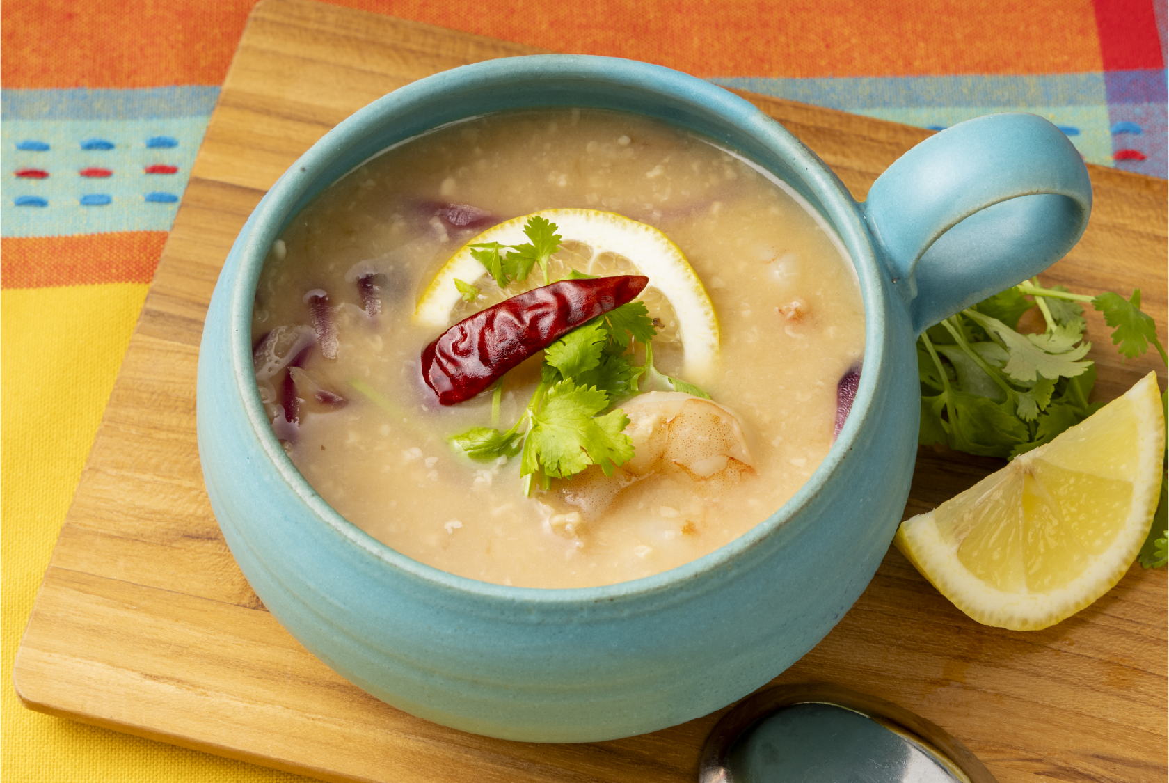 2. しめじ、スライスした赤玉ねぎ、凍ったままのむきエビをAに入れ、加熱する。器に注ぎ、お好みでパクチー、1/4に切ったレモンを添える。