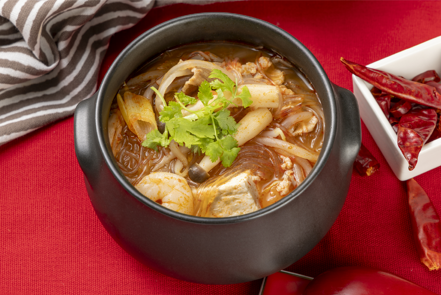 1. Aを煮立たせ、Bを入れる。中火で煮立たせ、春雨を加えてやわらかくなるまで煮る。パクチーを添える。