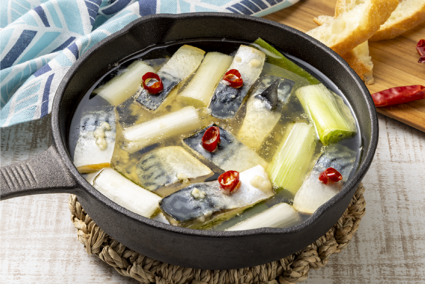 血行を促進するDHAやEPAが豊富なサバと、薬膳において体を温めるとされる長ねぎ、にんにく、しょうが、赤唐辛子。この組み合わせを熱々のアヒージョにしてぽかぽかに!