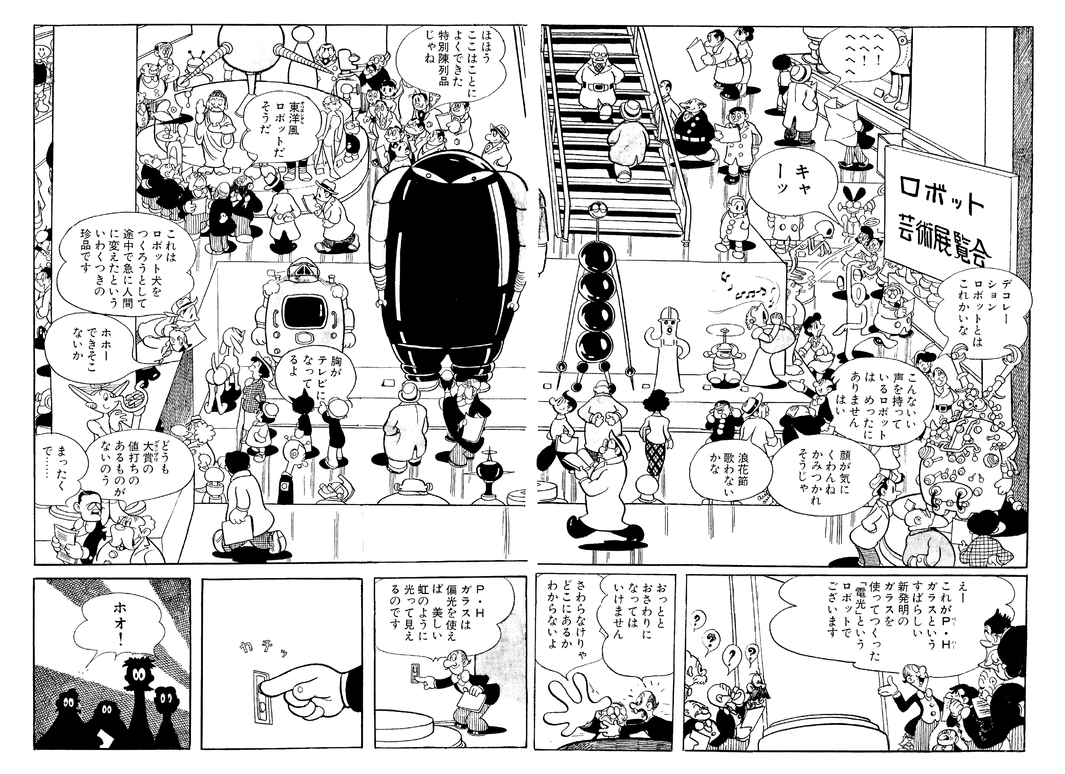 「モーターショー的な感じでたくさんのロボットが展示されているという、今となっては不思議なことでもないんですが、当時は、こんなことになるのか!と不思議な未来の話としてわくわくしました」(高橋さん)/手塚󠄁治虫『鉄腕アトム①』電光人間の巻より(講談社/手塚󠄁治虫文庫全集)