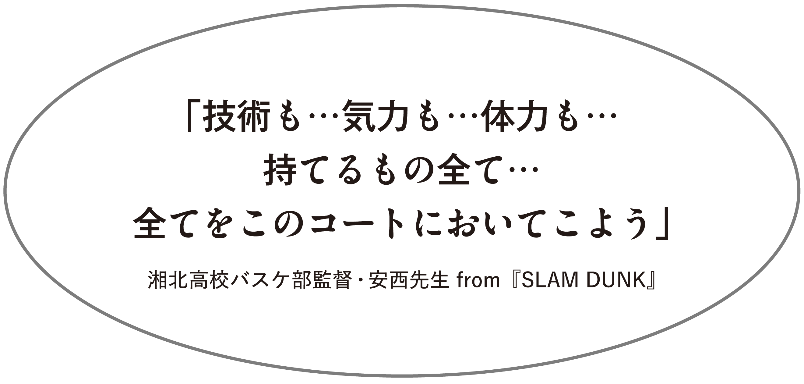 あと、豊玉戦のハーフタイムに、目を怪我した流川が『今日もあれやりましょーよ。オレたちは(強い)ってやつ』って言う場面があったと思うんですけど、実際に今シーズン、僕の後輩が『一回みんなで集まりません?』と言ってきて、おお、偉いなとうれしくなって。ああいう言葉は、真剣に向き合っていないと出てこないですから。漫画と同じようなシチュエーションが現実にも起こるんです。『SLAM DUNK』の世界と現実が混ざり合って行ったり来たりしている感覚とでもいうか。たまにベンチで試合を見ていて、相手チームや観ている方は『絶対入らねぇよ』と思っているだろう局面があるんですが、それこそ流川が三井(みつい)にかける『そんなタマじゃねえよな』という言葉がポンと浮かんできて、次の瞬間、本当に仲間がシュートを決めてくれるんです」