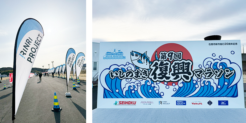 風が強く吹く中「RINRI PROJECT」のぼりが、ランナーが駆け抜けるコース沿いに設置されました。
