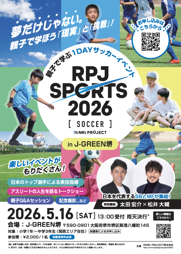 5/16(土)にJ-GREEN堺にて元サッカー日本代表2名による実技指導とトークショーを交えたRPJ SPORTS 2026 SOCCER を開催。ご参加をお待ちしております!